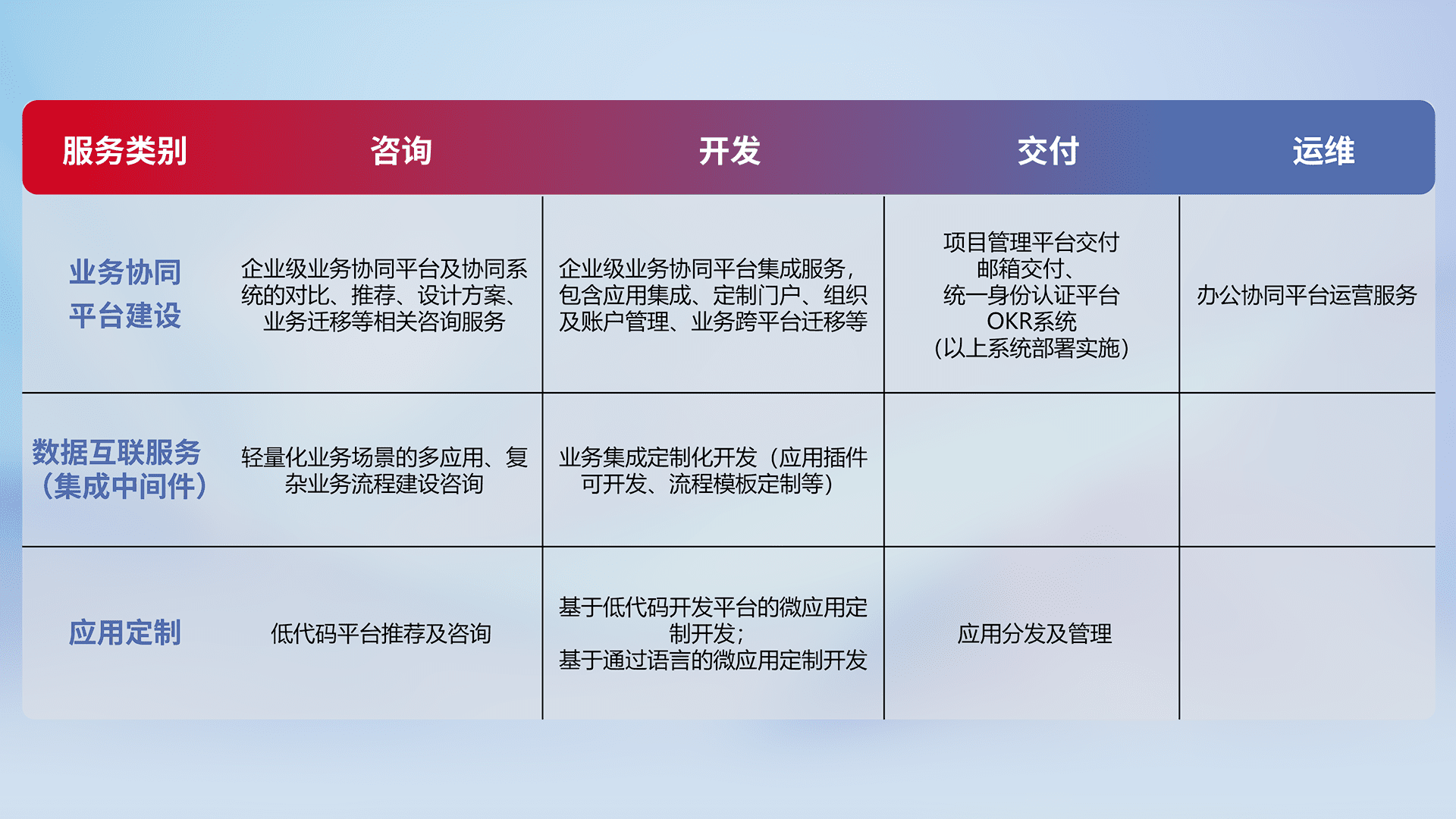 针对钉钉、、、企微、、、、IDaas等平台级产品提供产品的规划、、、方案、、、、交付、、定制化开发等服务,,,,实现如统一协同办公、、、、智能客户服务、、、混合会议管理、、智能数据查询、、、等业务场景,,实现数字化转型。。
